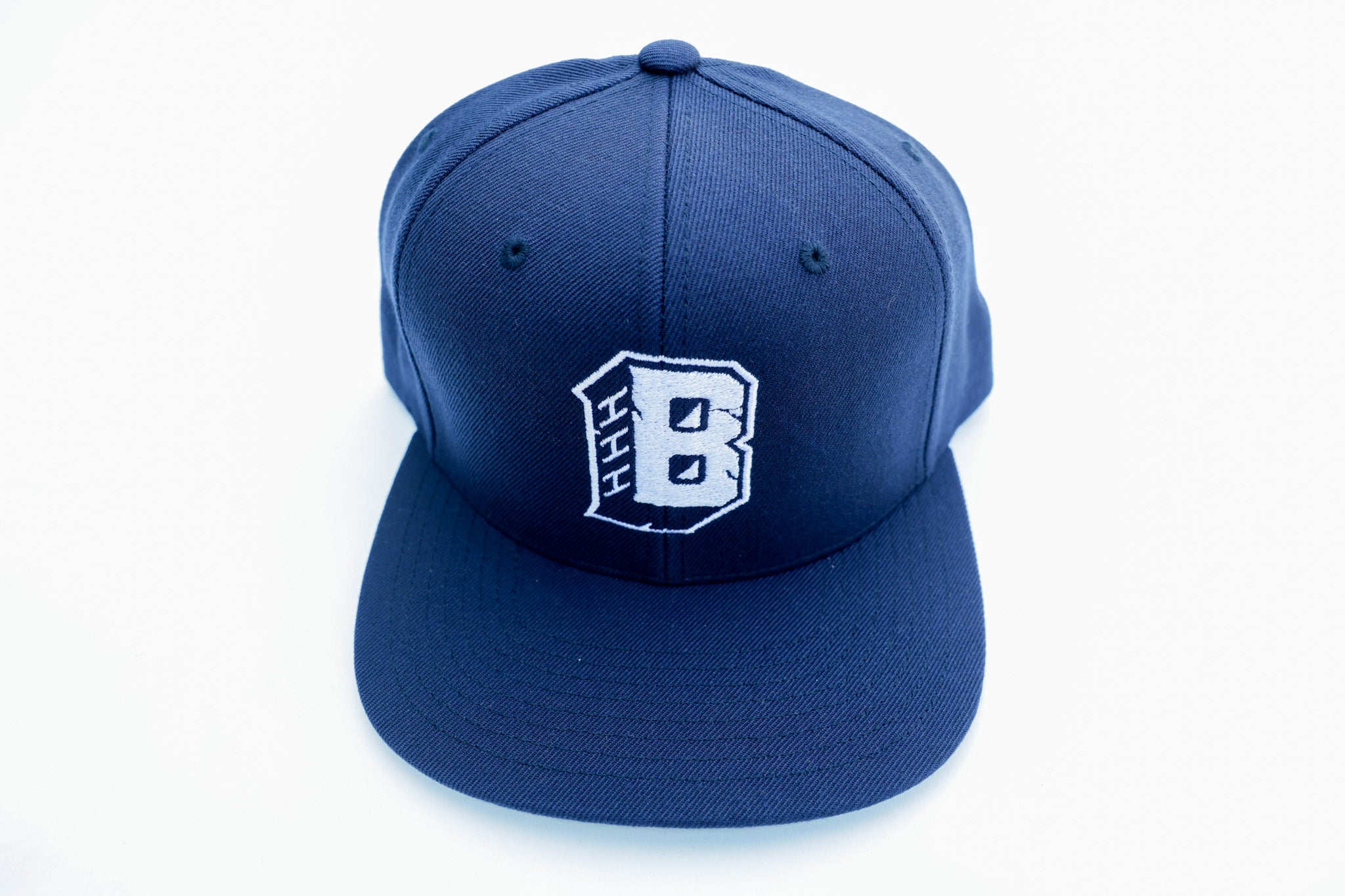 Our classic original snapback hat. This features our original “B” logo embroidered on the front panels in matching, navy blue and white embroidery.